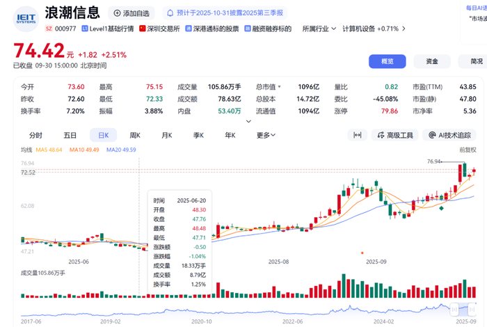 在国庆节前的最后一个交易日,浪潮信息股价上涨2.51%,市值涨至1096亿元。