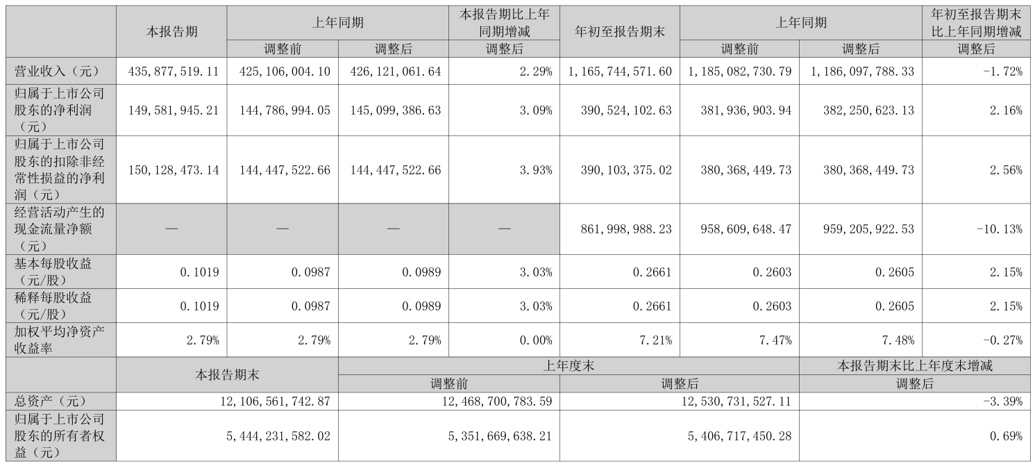 财报显示,营收方面,年初至报告期末营业收入 11.66 亿元,较上年同期调整后下降 1.72%;归属于上市公司股东的净利润 3.91 亿元,同比增长 2.16%,扣非后净利润 3.90 亿元,同比增长 2.56%,盈利质量良好。基本每股收益 0.2661 元,同比增长 2.15%,盈利能力稳步提升。